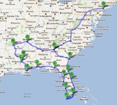 Wir landen am 10. Februar 2012 in Atlanta, von da aus fahren wir nach Savannah, dann nach St. Augustine, Cocoa, von hier aus eine 4-Tages-Kreuzfahrt auf die Bahamas-Inseln, dann Florida City, Key West, Cape Coral, Inverness, Tallahassee, Mobile, New Orleans, Natchez, Vicksburg, Hot Springs, Memphis zurück nach Atlanta. Von dort fliegen wir weiter nach New York.