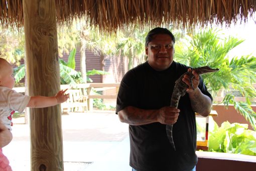 Tatsächlich hat er uns den Unterschied zwischen den aggressiven Krokodilen und den friedlichen Alligatoren erklärt und einige Kunststücke vorgeführt.