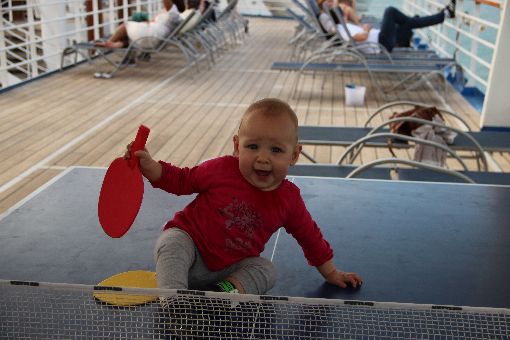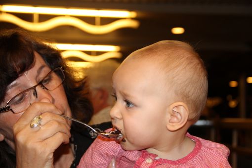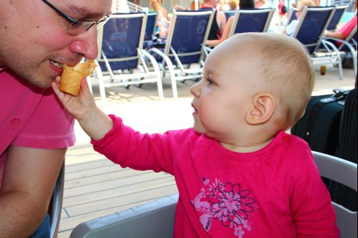 Jetzt geht die Kreuzfahrt los und bevor wir in die Zimmer dürfen, erstmal noch eine kleine Stärkung. Und Papa muss auch was essen...