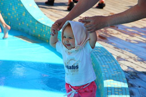Um sich vom Grüßen zu erholen, hat die sich mit einem Kopftuch verkleidet und an der Wasserrutsche etwas erholt: